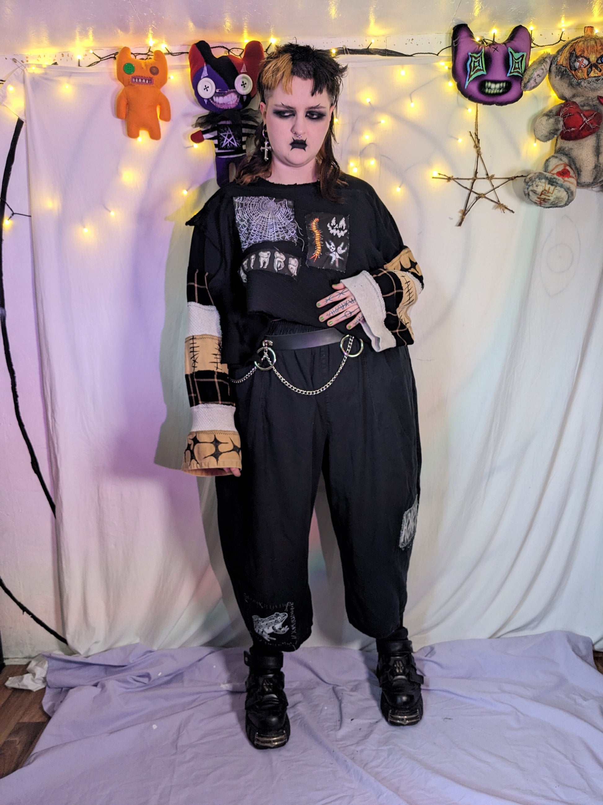 The garment is made from clean second-hand fabrics and clothing. These details add texture and charm! There may also be leftover chalk lines; these will wash off.