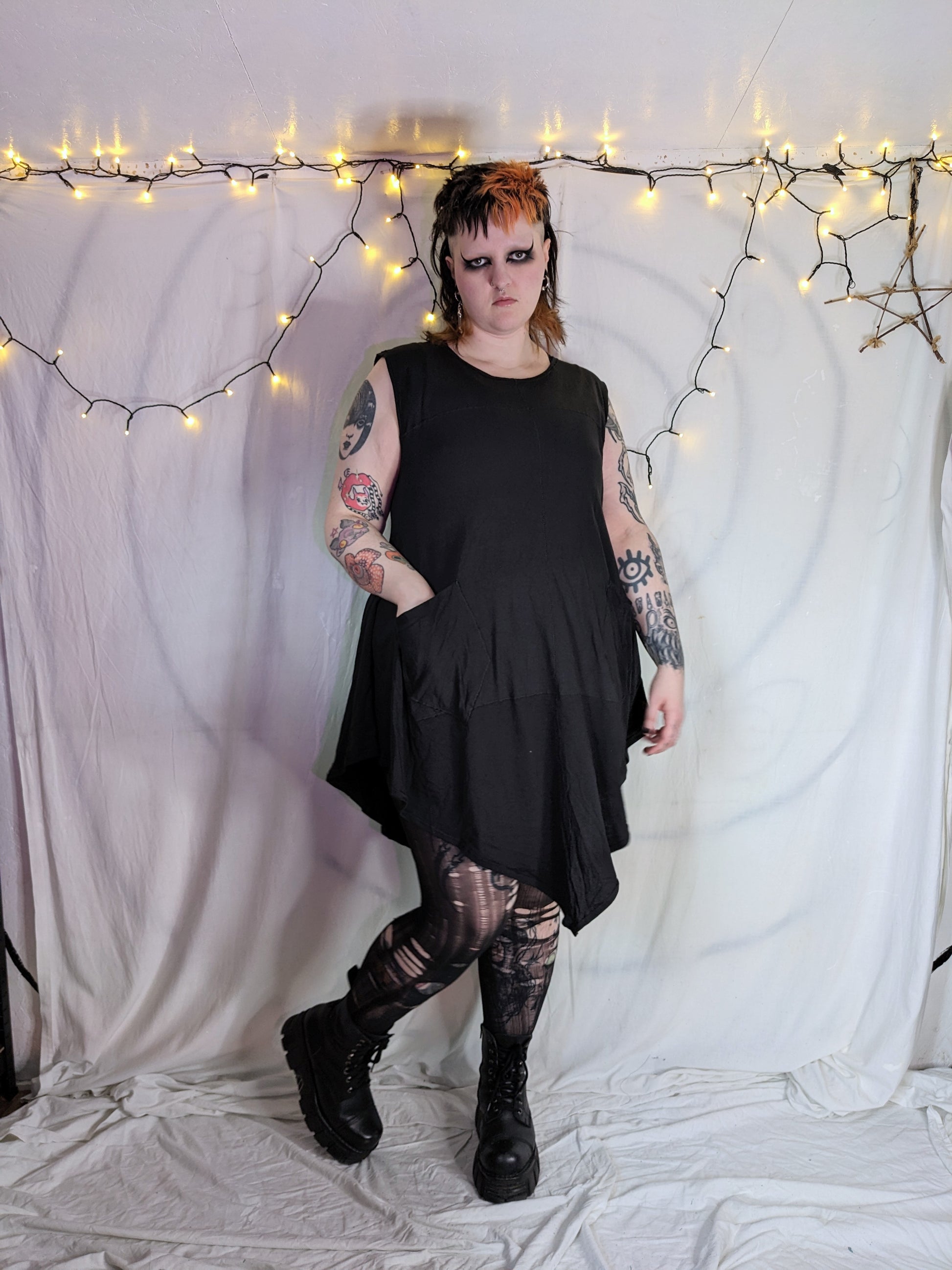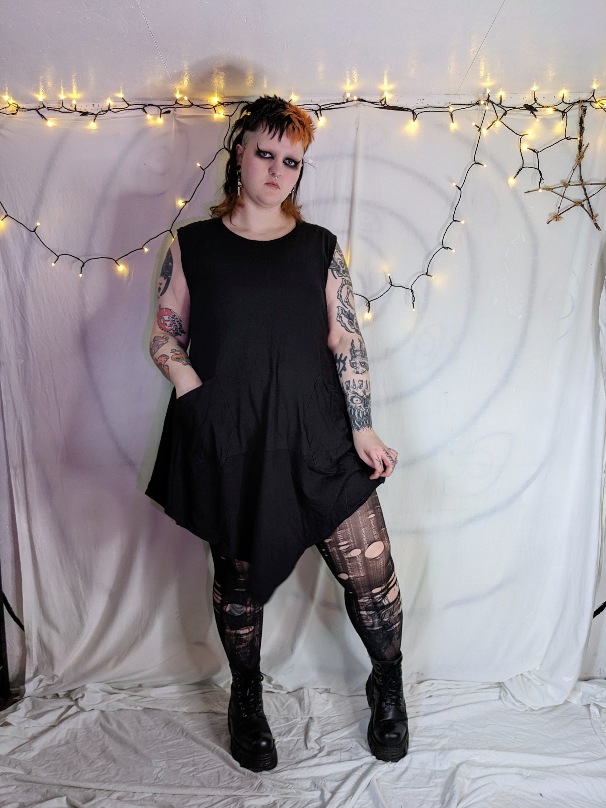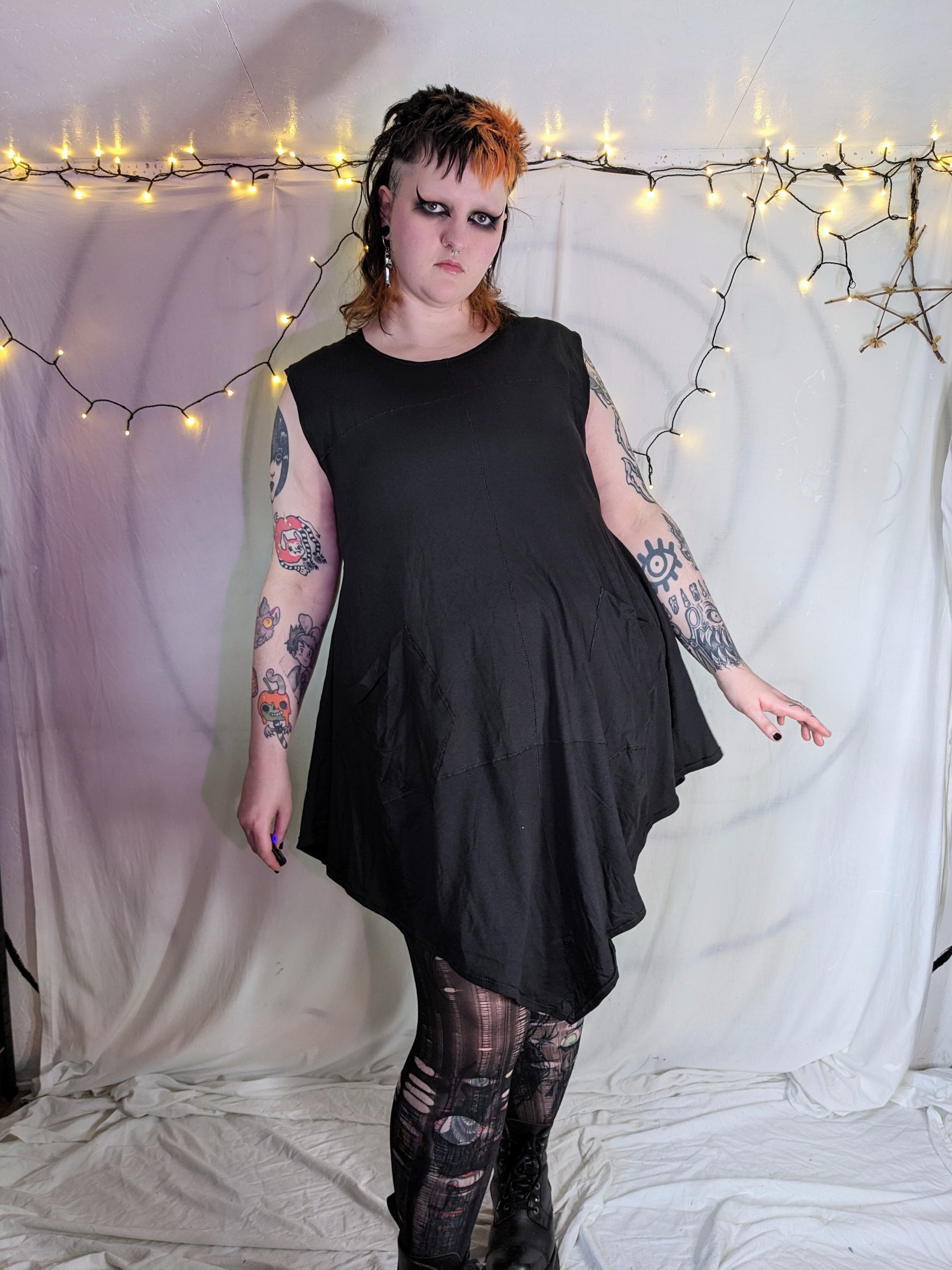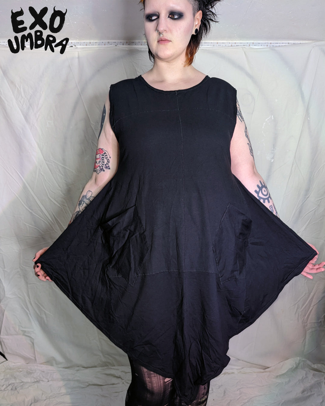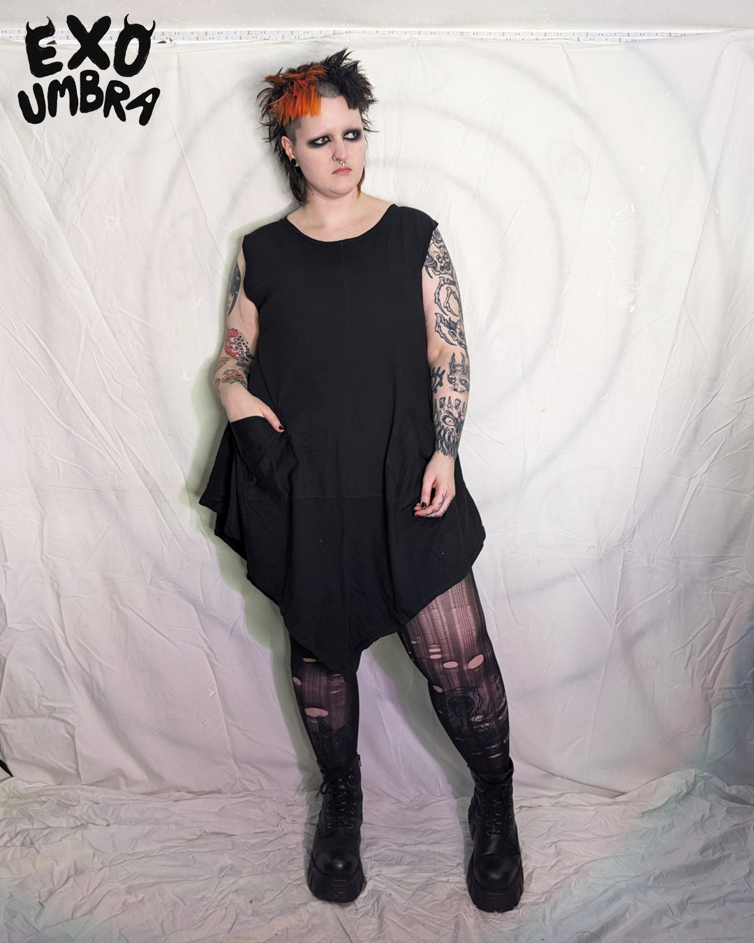 The model is 5'7" and wears UK 18 on top, 22 on the bottom, wearing an Exoumbra L