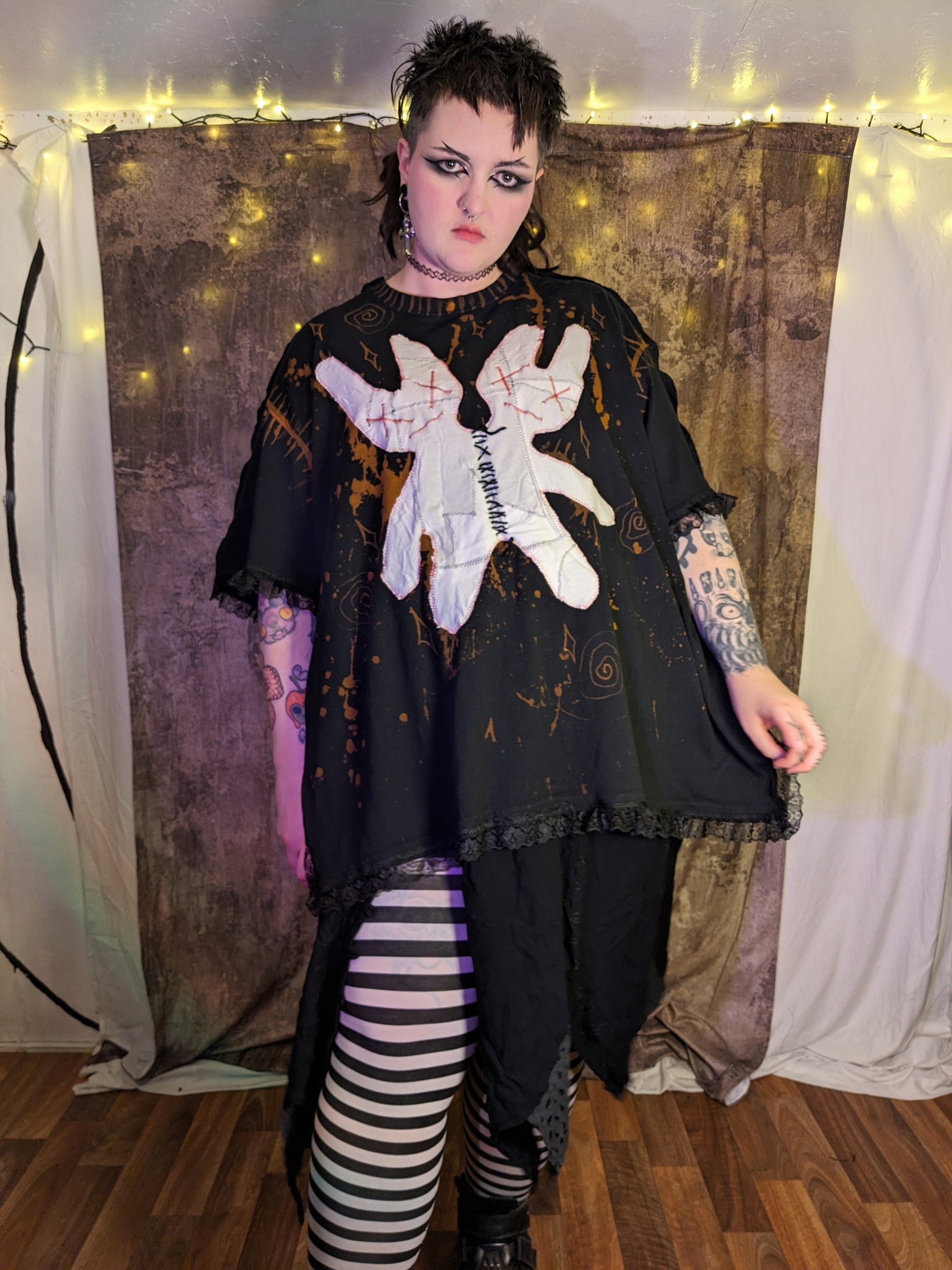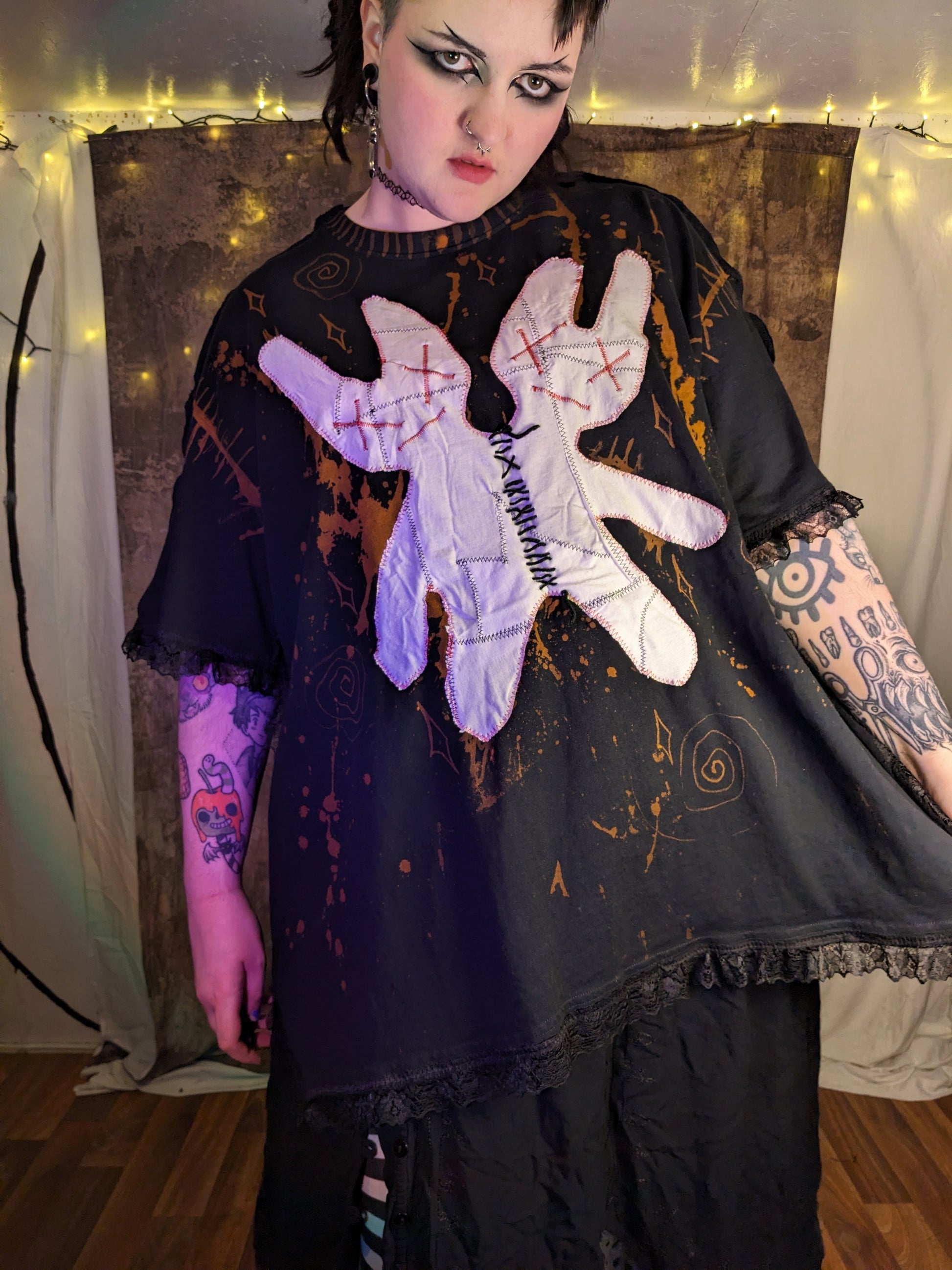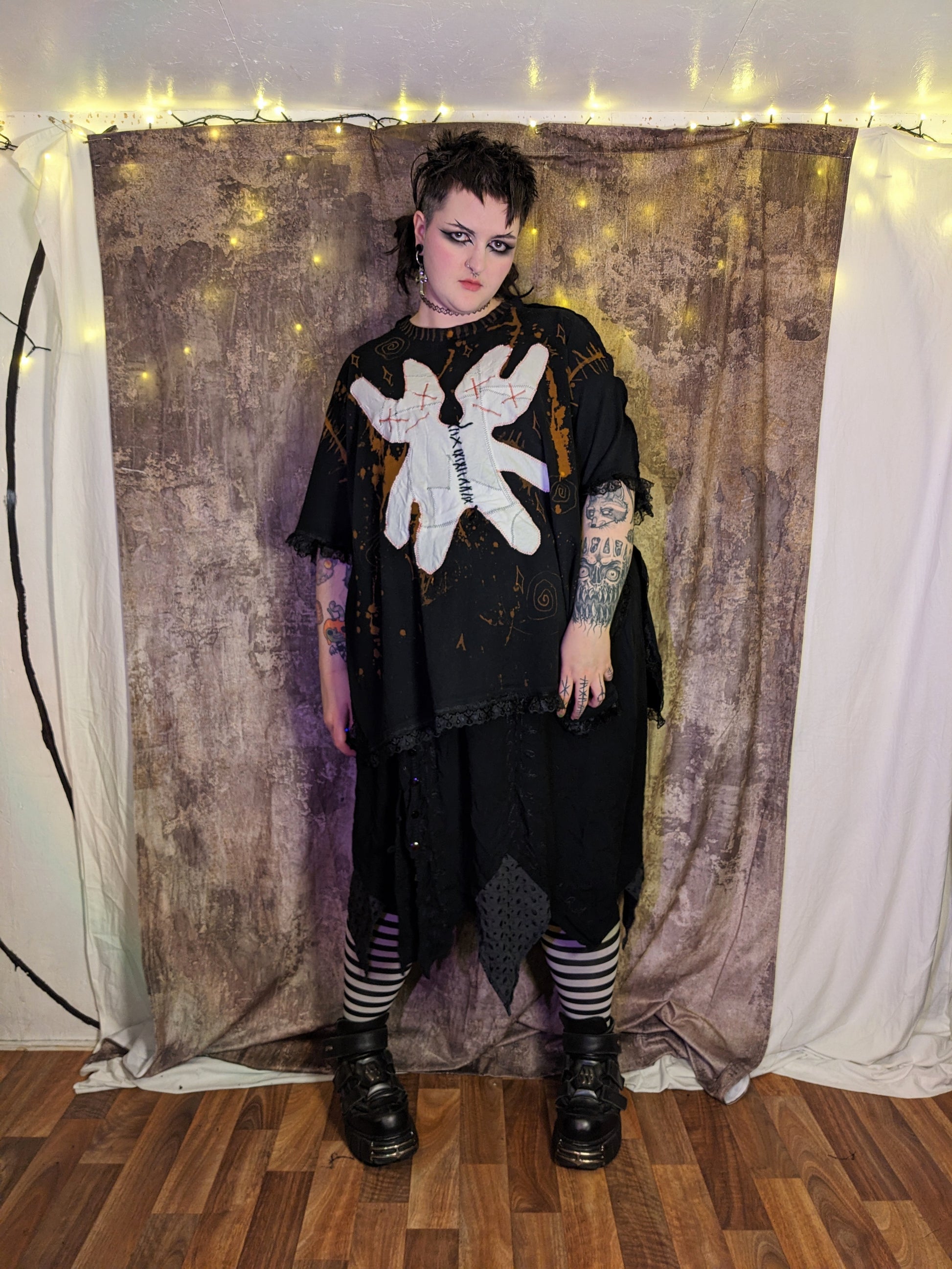 The garment is made from clean second-hand fabrics and clothing. These details add texture and charm! There may also be leftover chalk lines; these will wash off.
